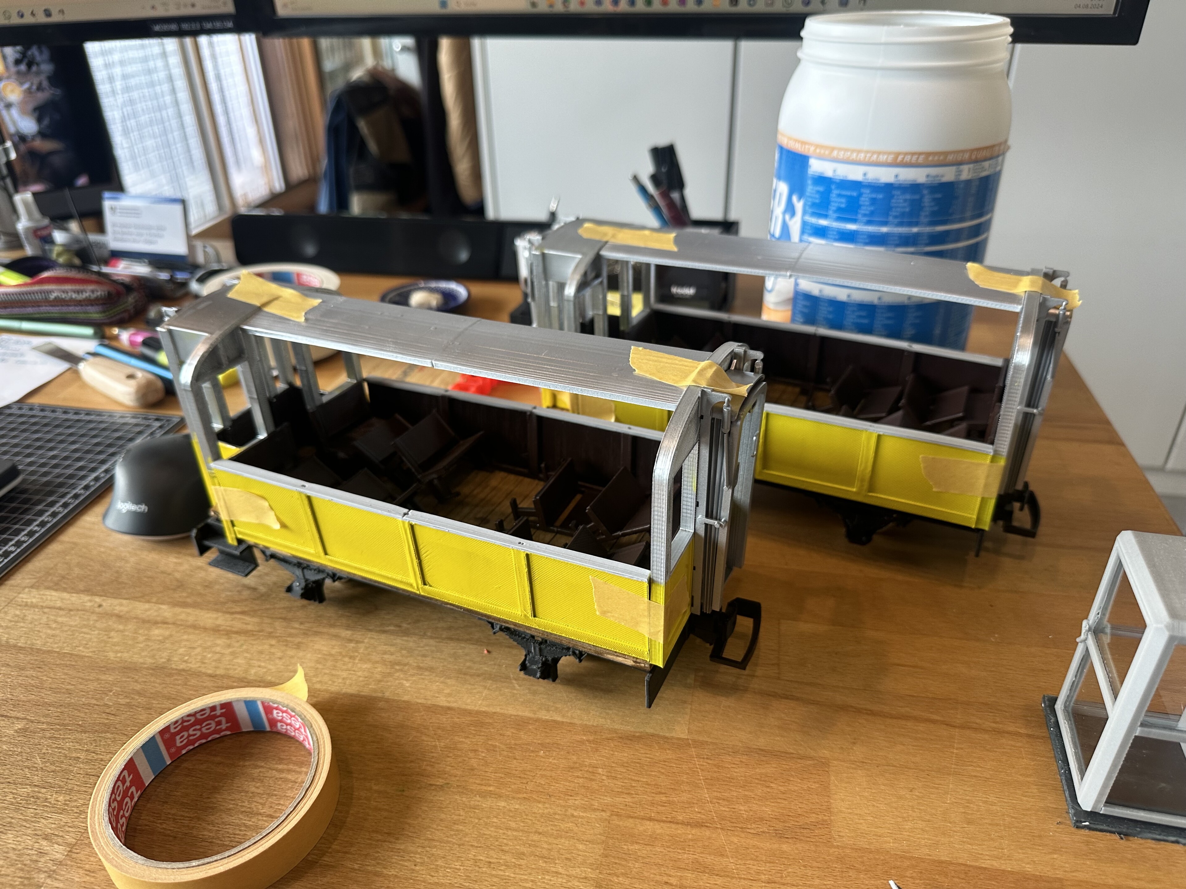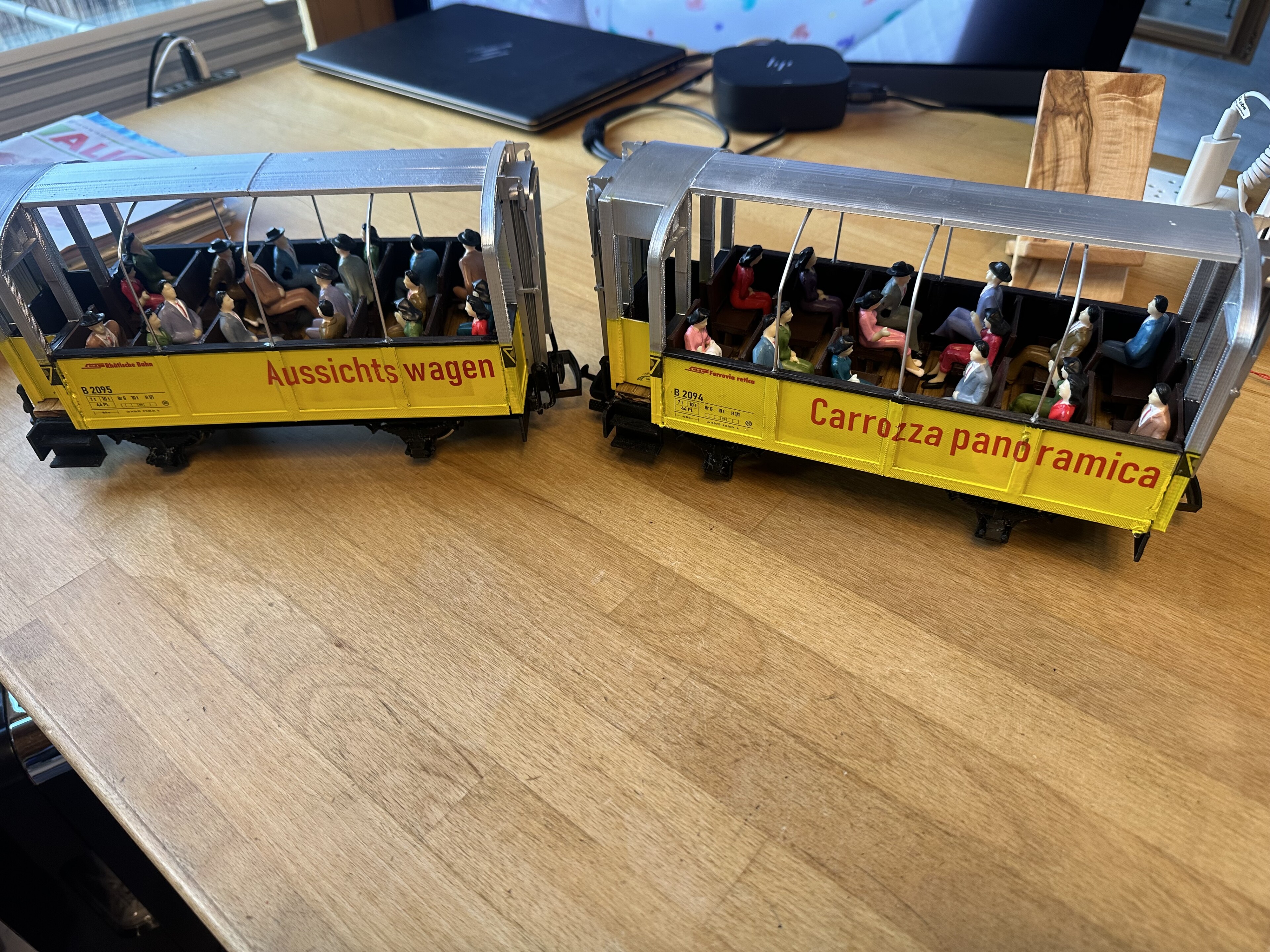 Eigentlich hat mir schon immer mindestens ein Aussichtswagen in der Sammlung gefehlt. Die beiden Wagen sind jedoch eher spontan entstanden. Beim Ausdrucken meines neuen 3D-Druckers (Flashforge Adventurer 5M Pro), konnte ich so gute Resultate erzielen, dass ich ein komplettes Wagenchassis gedruckt habe. Dieses hat früher wegen Wrapping nie geklappt.