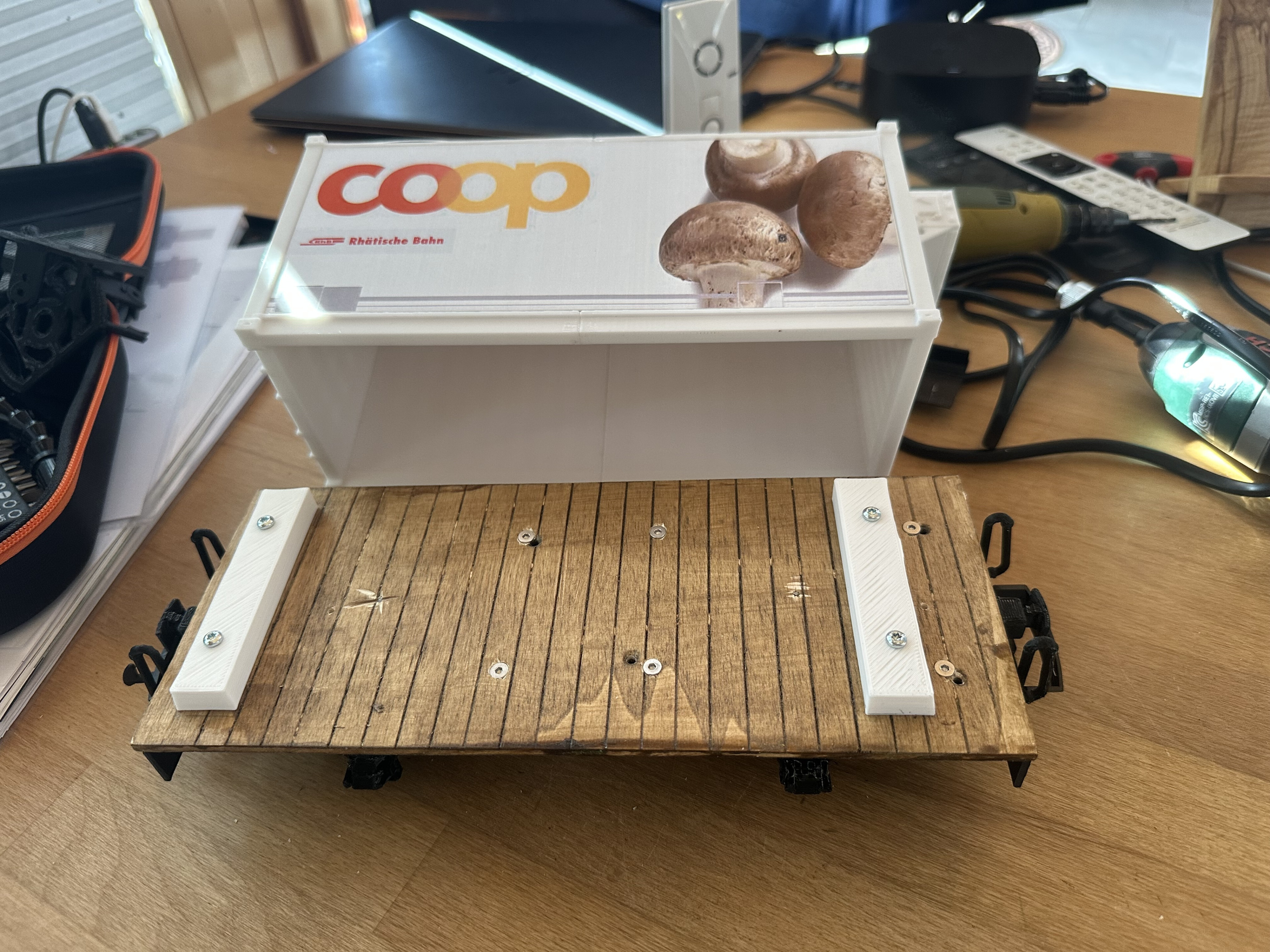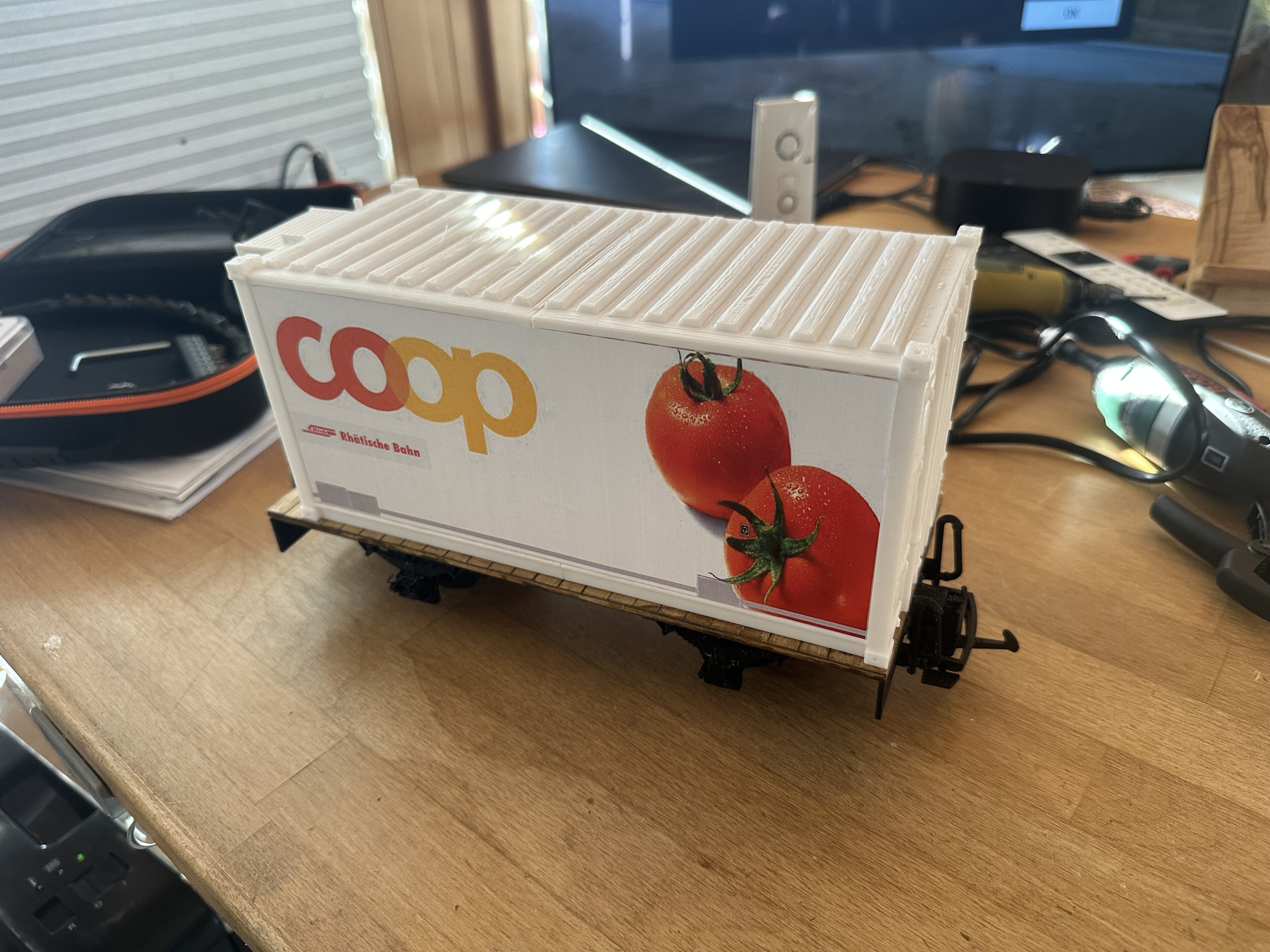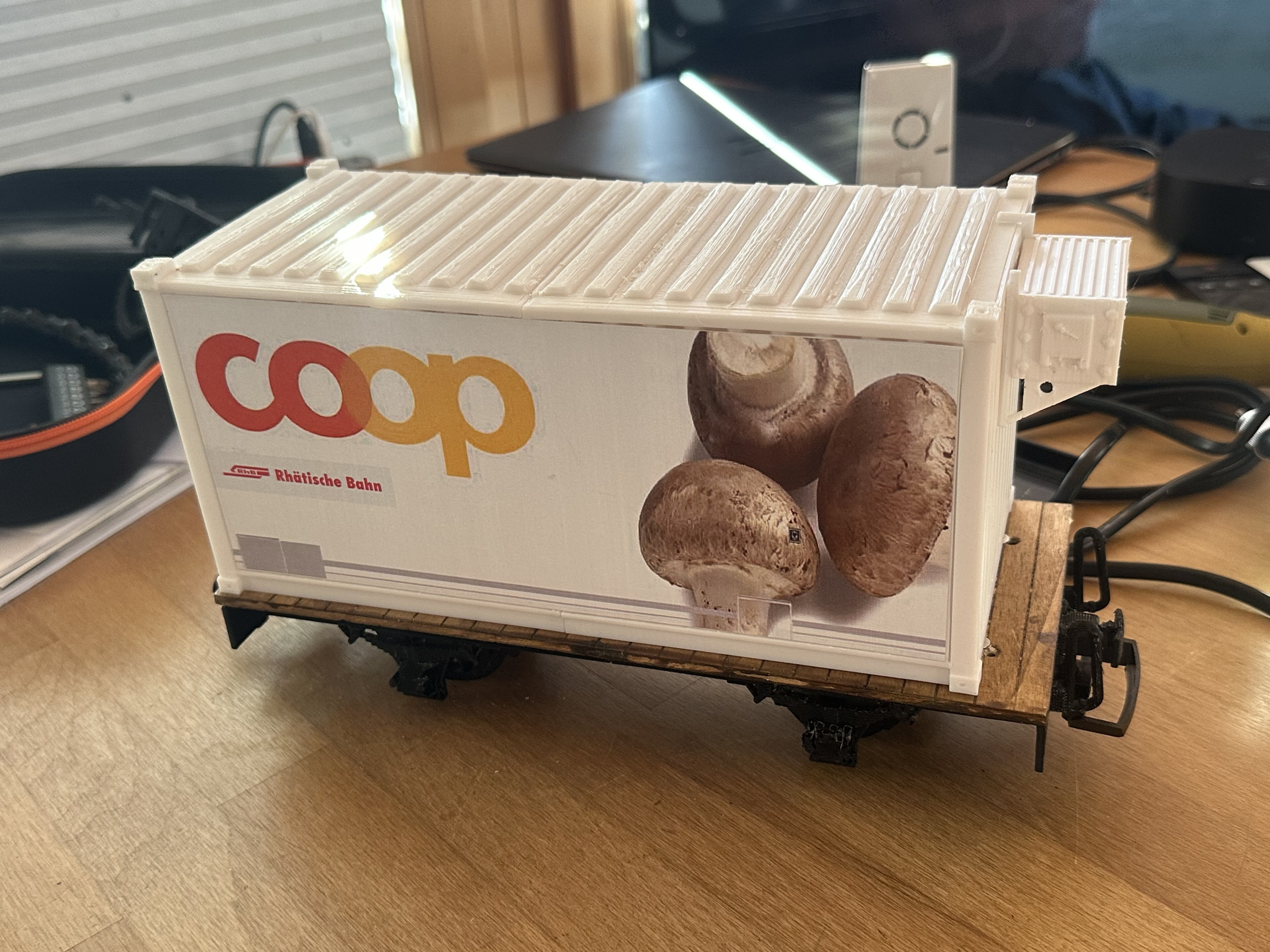 Den Container habe ich im Internet gefunden und von den Massen her auf das vorgegebene Chassis angepasst. Das Coop-Bild ist vom Internet heruntergeladen und auf die Grösse des Containers anpasst worden. Das Bild ist auf wetterfeste Spezialetikette ausgedruckt und auf 0.5 mm PS aufgezogen. Die Bilder sind auf beide Seiten des Containers geklebt.