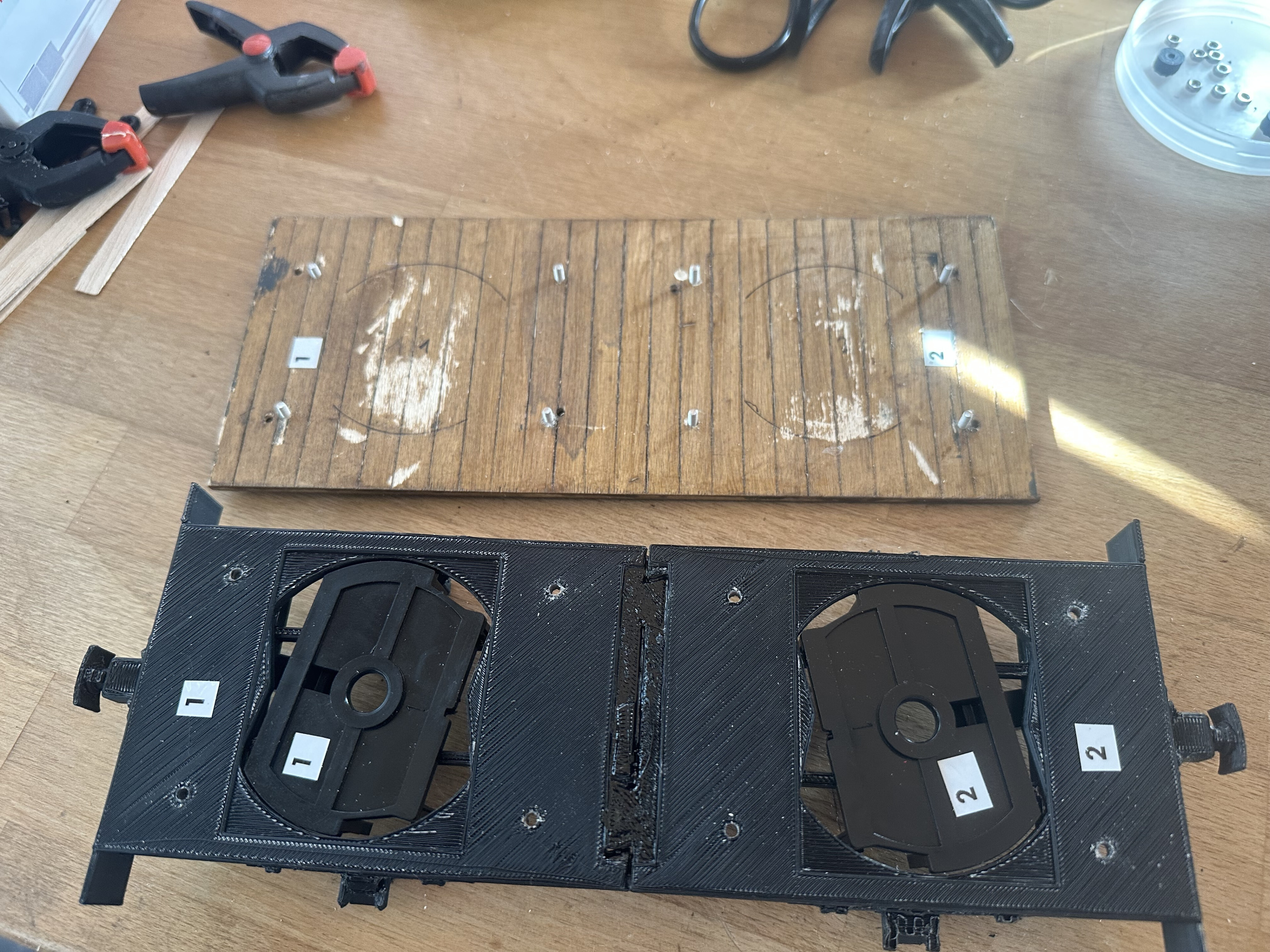 Die Basis für den Wagen bildet das LGB-Chassis, welches z.B. auch bei den Aussichtswagen und anderen Eigenbauten zum Einsatz gekommen ist. Dieses Chassis drucke ich mit ABS selber in zwei Teilen aus. Diese werden verklebt und mit Messingstangen verstärkt. Beim vorliegenden Containerwagen habe ich noch vorhandene einachsige LGB-Drehgestelle eingesetzt. Die aus ABS gedruckten sind eher etwas spröde und brechen beim Einsetzen gerne ab.