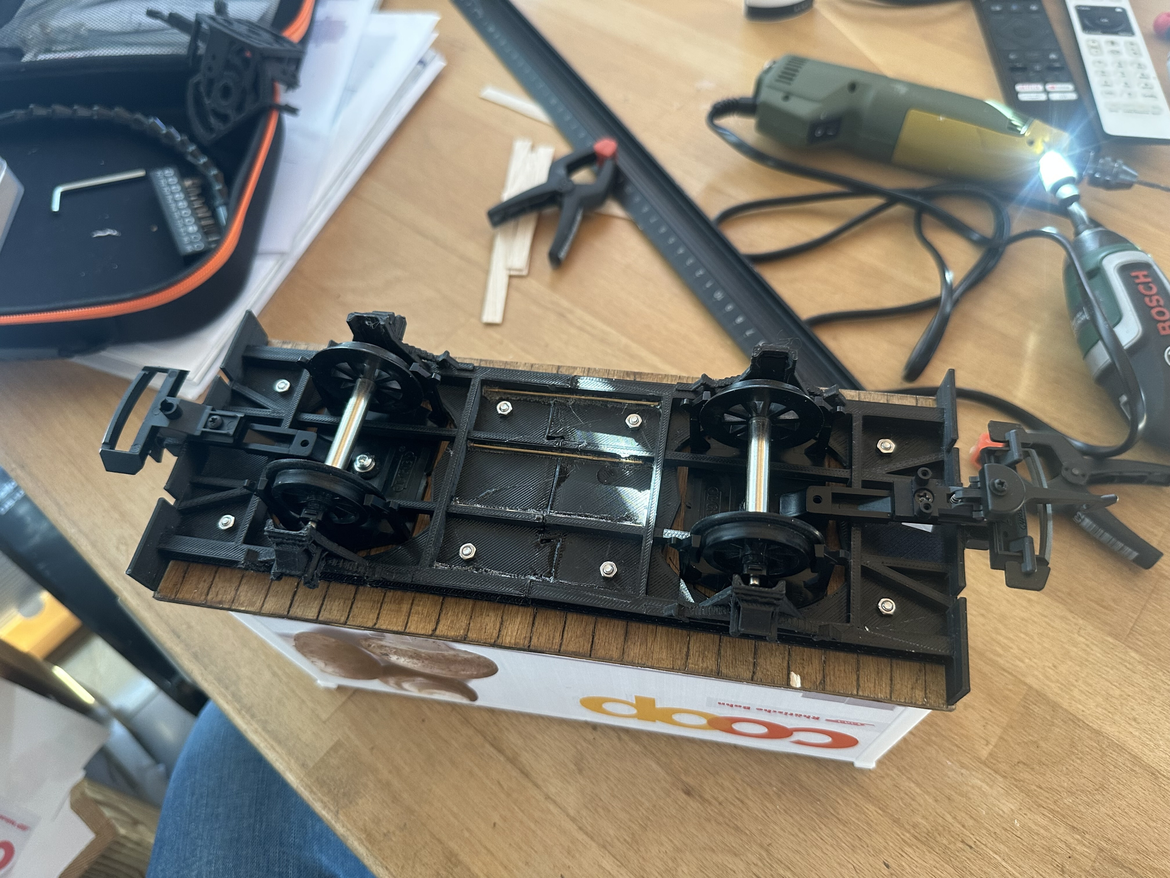 Den Bildern ist der Aufbau des Wagens zu entnehmen mit einer 4 mm Sperrholzplatte, welche auf dem Chassis aufgeschraubt ist. Deko-Elemente (Puffer, Bremsschläuche, etc.) sind entweder ausgedruckt oder aus dem Zubehör-Handel.