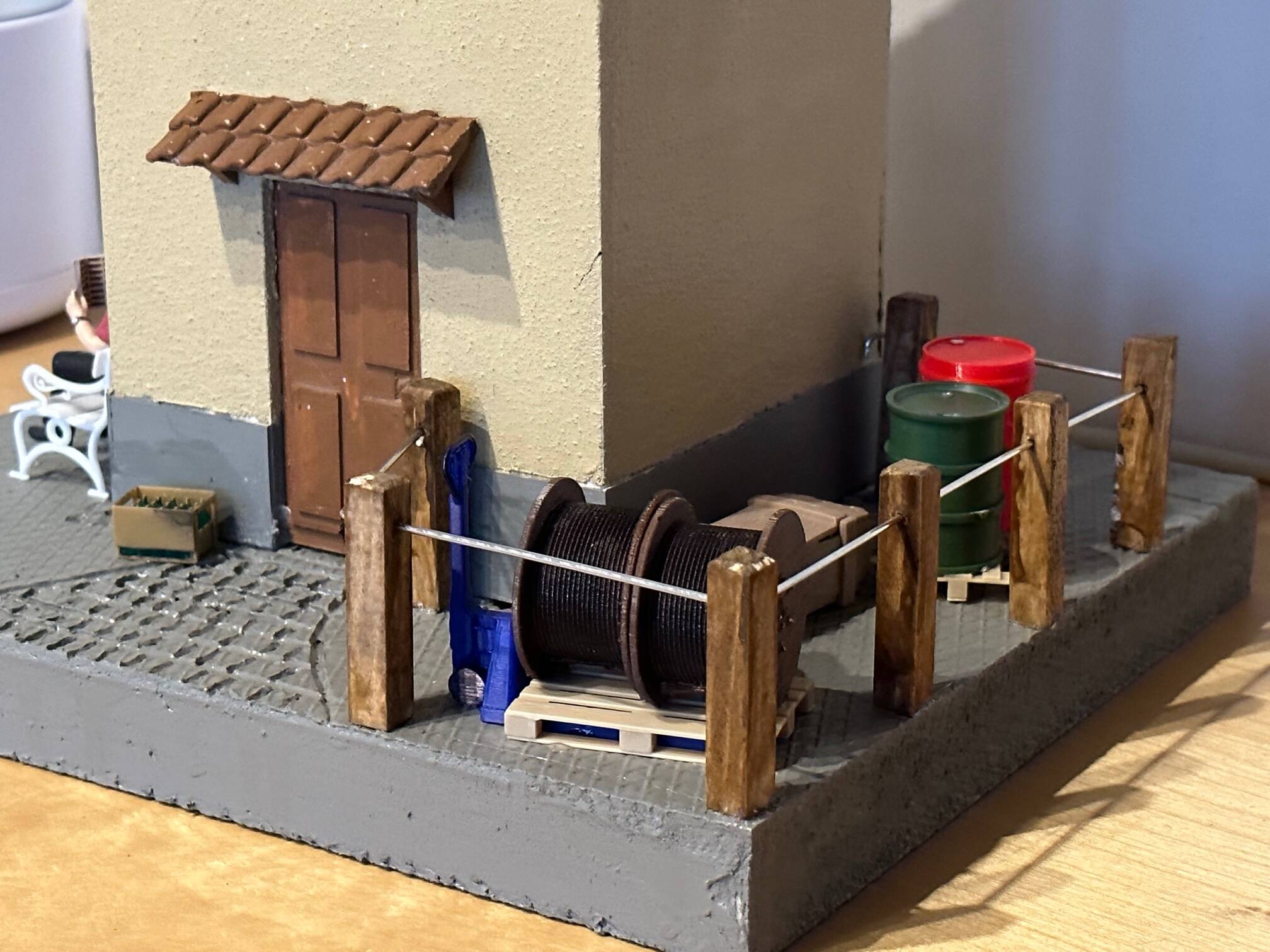 Die Trafostation ist aus PS-Platten und diversen 3D-Druckteilen gebaut. Im Kamin ist ein Zapfen mit Solarzelle eingebacht, an welchem eine kleine LED-Kette angeschlossen ist, welche bei Dämmerung automatisch einschaltet.