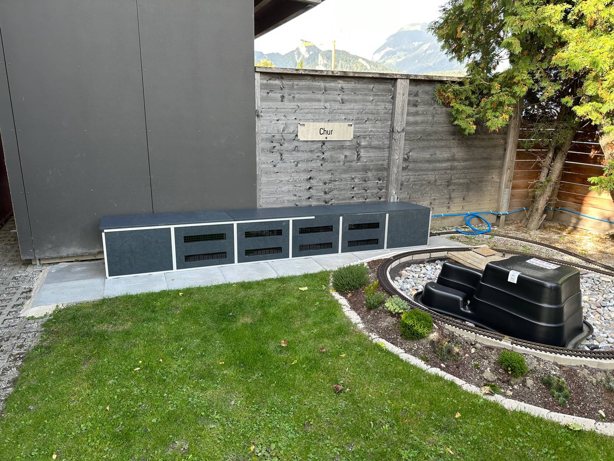 Darunter verbirgt sich die Haupteinspeisung in die Anlage, welche eine unterirdische Leitung zum Bahnhof Maienfeld, zum Heidihaus und zu den beiden Weichendekodern hat.